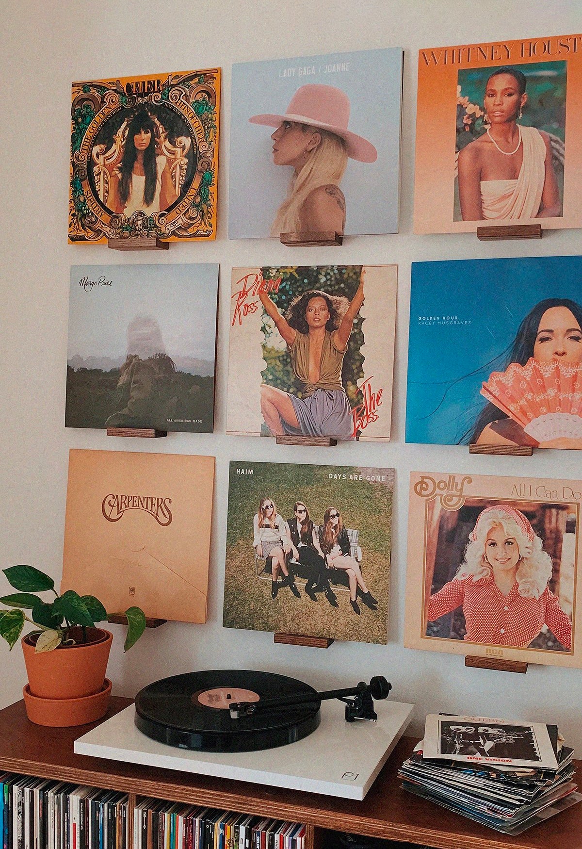 We recommend using blue tack or masking tape to temporarily stick your record gallery wall up in your desired space. From there, you can lightly mark underneath your records with a pencil and use as a guide to install your shelves. Use a spirit level to make sure everything is super straight!